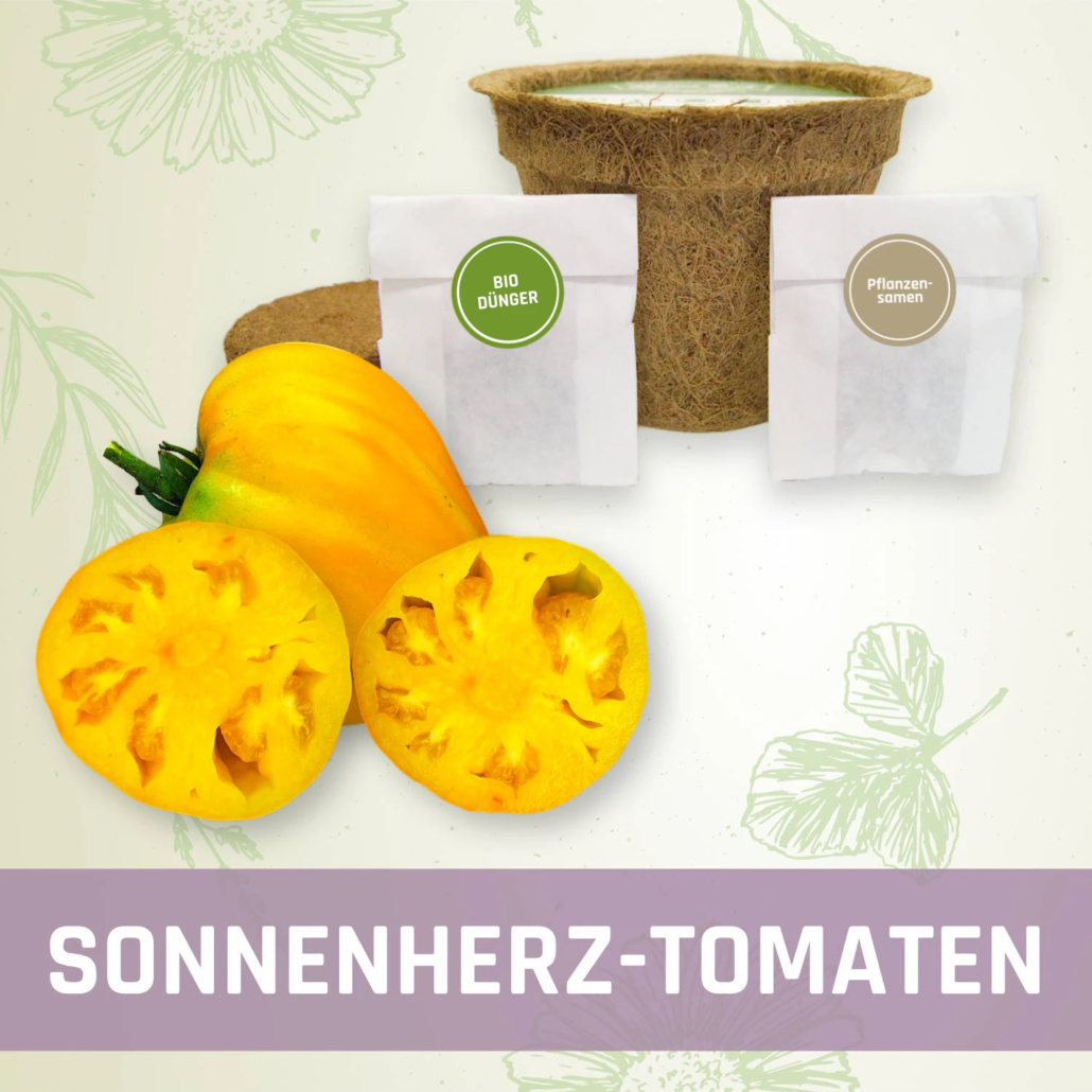 Bei unseren Sonnenherz-Tomaten handelt sich um frühe Ochsenherztomaten mit lichtem Pflanzenaufbau und sind daher gut zu pflegen. Gelborange abreifende, vielkammerige Früchte mit hohem Anteil an Fruchtfleisch und wenig Gallertmasse sind, neben der herzförmigen Anmutung, nur ein paar tolle Eigenschaften dieser Sorte. Die Tomaten glänzen zudem mit einem sehr guten, fruchtig aromatischen Geschmack. Das Fruchtgewicht kann dabei zwischen 250-350g liegen.